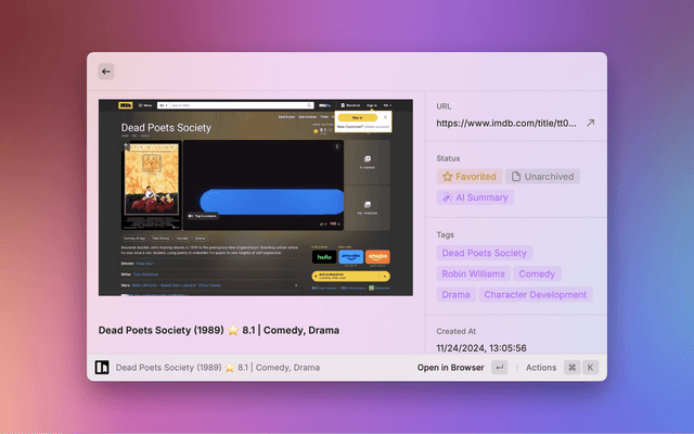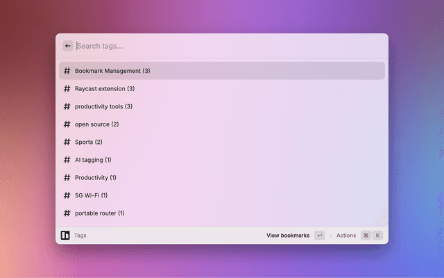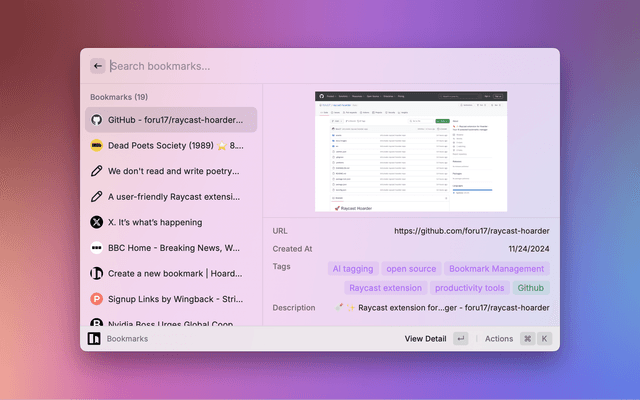All powered by Karakeep's robust API, bringing your bookmark management right into Raycast's streamlined interface.