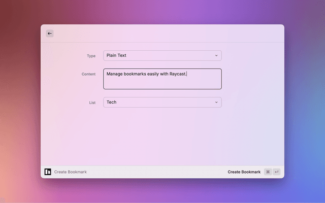 • Fast Bookmark Creation: Create new bookmarks directly from Raycast with just a few keystrokes