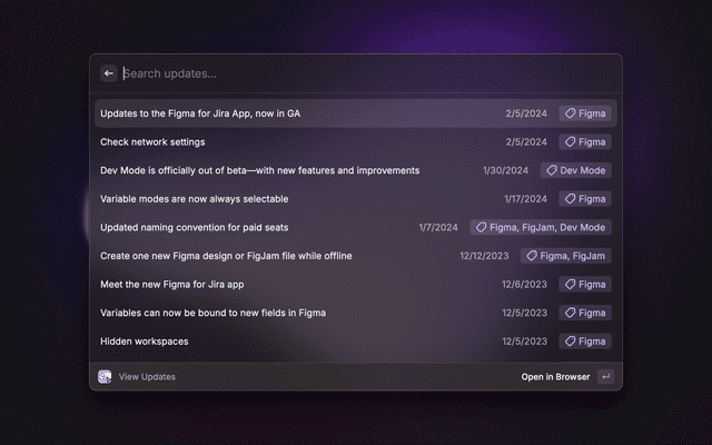 View Updates - See all the updates in the Figma product ecosystem, and quickly filter them if needed.