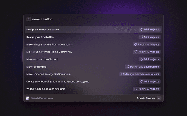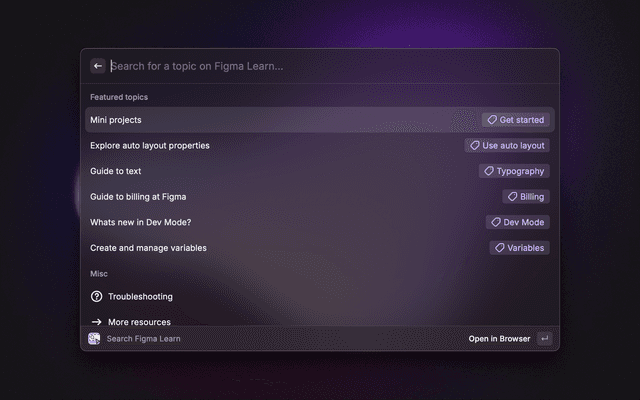 Your companion for the Figma Learn help center that helps you quickly search for topics and updates.