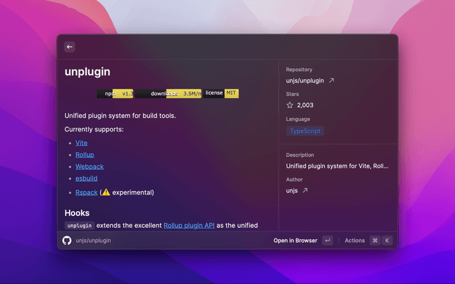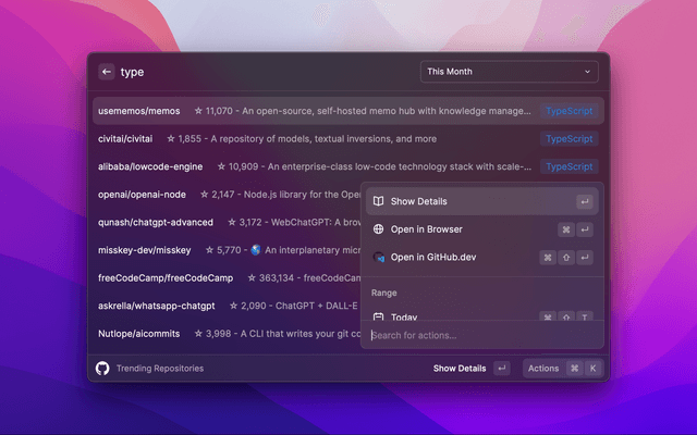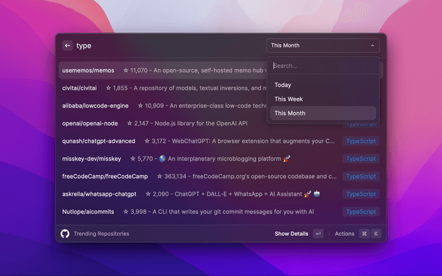 This is a Raycast extension that displays the top trending repositories on GitHub. You can filter by language and time period (today, this week, this month).