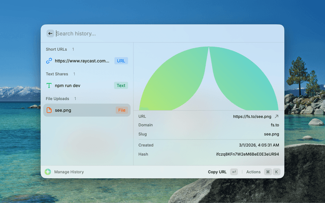 A powerful Raycast extension that integrates with S.EE, bringing URL shortening, text sharing, and file uploading right into your Raycast launcher. Share anything in seconds — a link, a code snippet, or a file — all from your keyboard.
