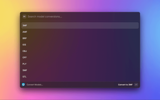 Effortlessly convert between various NURBS/Parametric and mesh 3D model formats, including STEP, STL, OBJ, and more.