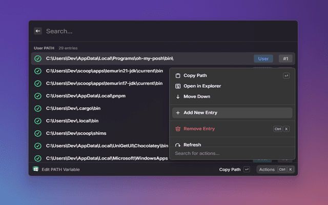 - Edit PATH — Dedicated PATH editor with drag-to-reorder, existence validation, and duplicate detection