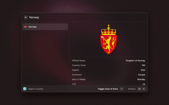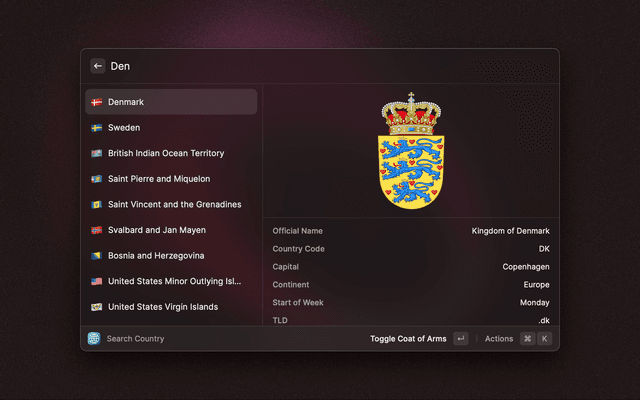 Quickly lookup country data by querying local copy of restcountries.com.