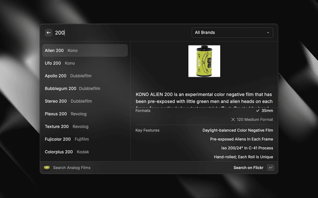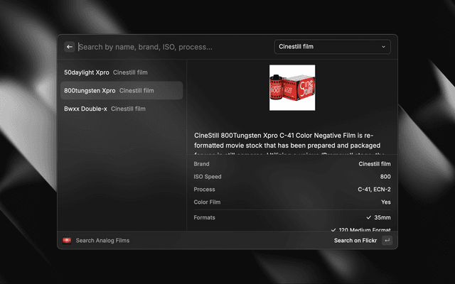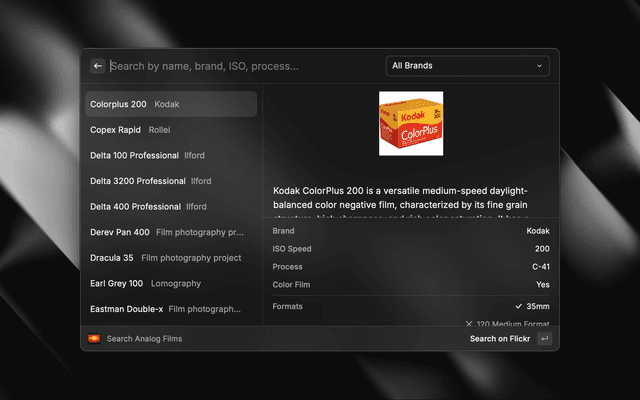 Browse analog films by name, brand, ISO, process, and more.