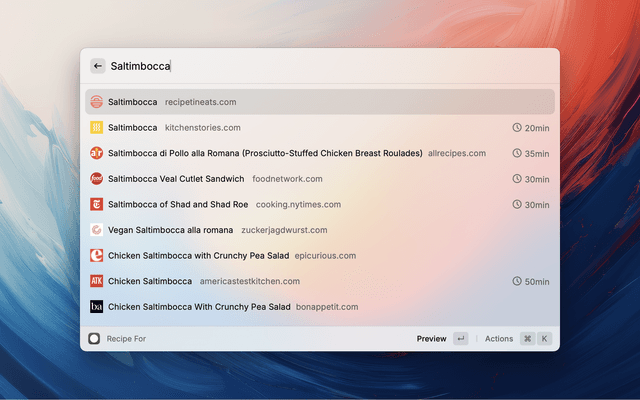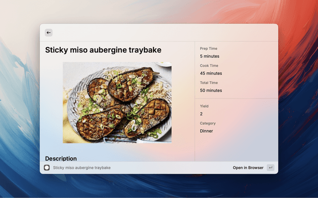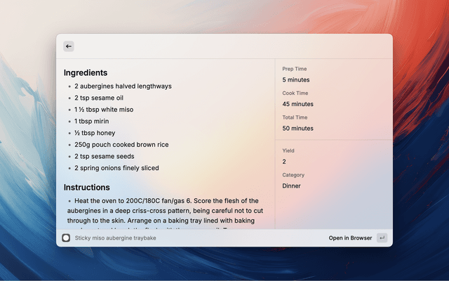 • If the containing webpage uses the JsonLD version of https://schema.org/Recipe notation, the recipe will be extracted and can be viewed directly in Raycast.