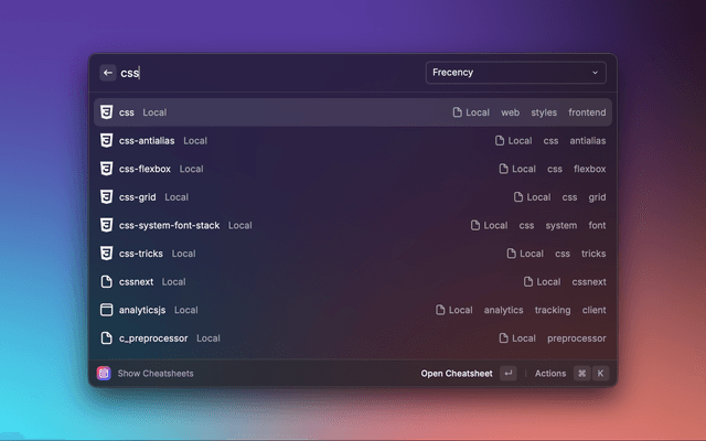 Access a curated collection of DevHints cheatsheets plus the ability to create and manage your own custom sheets - all without leaving your keyboard. You can also import Markdown cheatsheets directly from your GitHub repositories and keep them up to date via a built-in Repository Manager. Search is smart and fast, prioritising titles over content so you find what you need instantly.