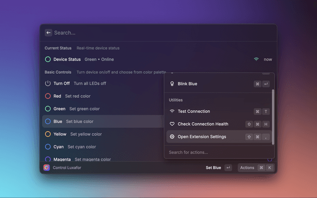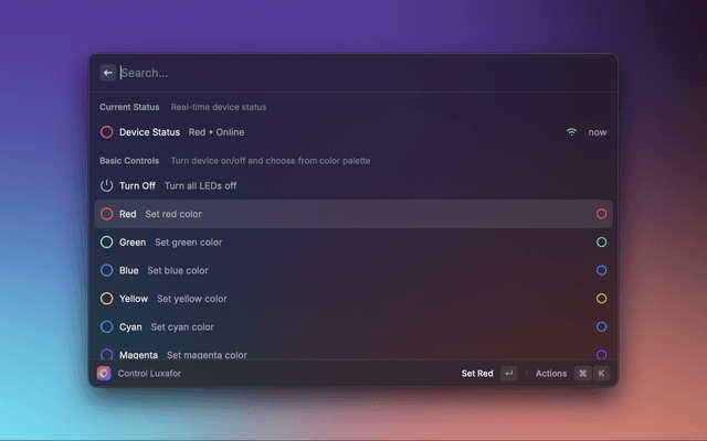 Control your Luxafor LED device directly from Raycast with real-time status monitoring and quick color controls. Perfect for developers, streamers, or anyone who wants quick access to their Luxafor device controls.