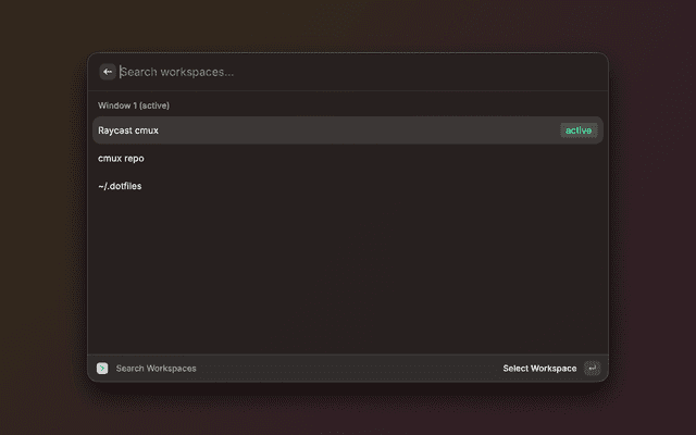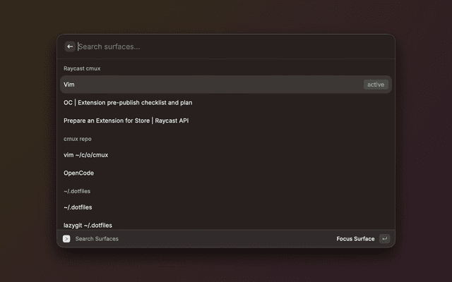 This extension lets you control cmux without leaving your keyboard. Commands are available via Raycast to navigate and manage your workspaces and surfaces directly from anywhere on your Mac.