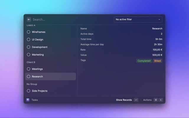 🔎   Search your time records   📋   Copy and paste fields   🆕   Create new tasks   ⏯︎   Start/Stop tasks