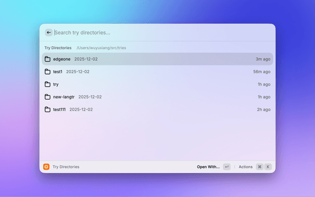 Open Raycast and search for "Browse Try Directories" to see all your experiments.