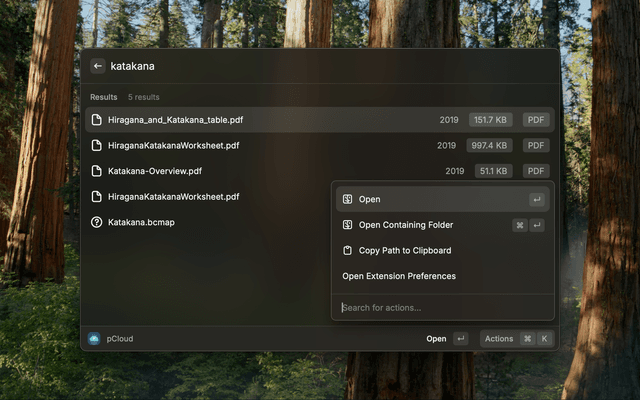 This extension allows you to interact with your pCloud files. Search them through the pCloud APIs, open them directly in Finder using your pCloud Drive.