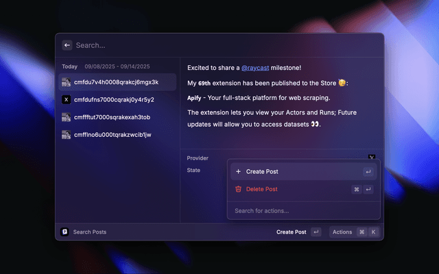 This is a Raycast extension for Postiz - The All-in-One Social Media Management Tool. With this extension you can: