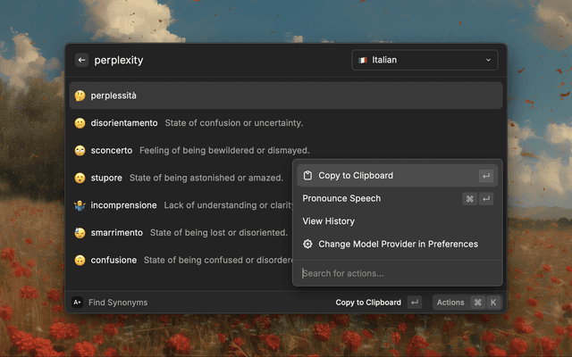 This Raycast extension allows you to search for synonyms using a Language Model (LLM) such as OpenAI, Grok, or Anthropic, with your own API keys.